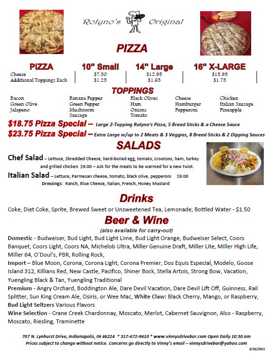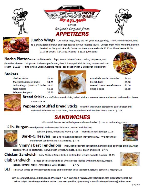 Welcome to Vinny's Drive Bar, a hidden gem nestled in the heart of Indianapolis at 707 N Lynhurst Dr. This vibrant establishment is not just any bar; it’s a culinary haven for those who appreciate good food, a fun atmosphere, and superb service.